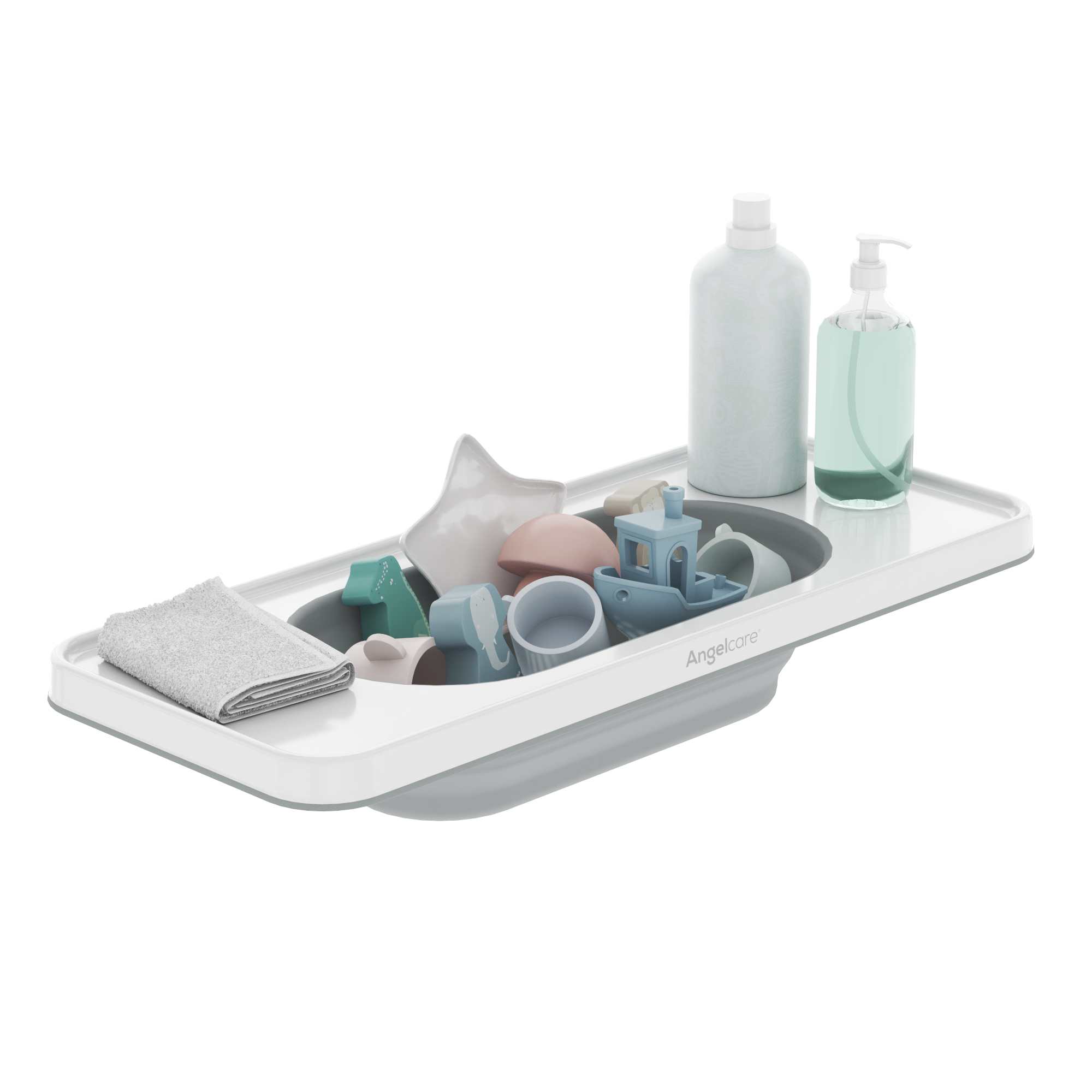 The new Angelcare bath shelf. Offering a streamlined solution for keeping your bathroom essentials neat, dry, and effortlessly organized.